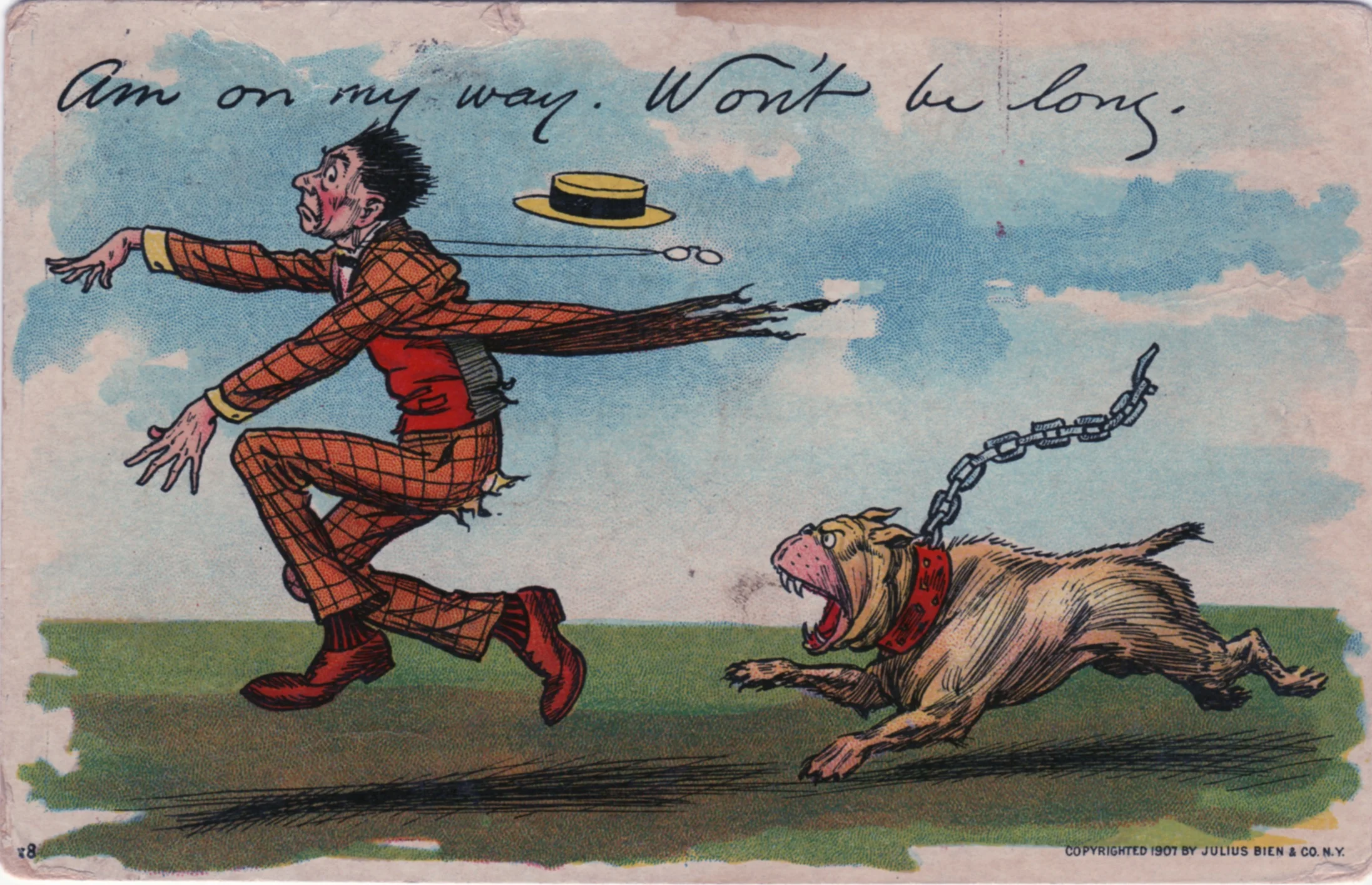 This week we have a lovely, slightly bizarre, 100 year old postcard. As you'll see it depicts an angry looking dog chasing a scared man in an ugly orange suit. The message, "Am on my way. Won't be long" appears to suggest that the writer will soon reunite with the recipient.