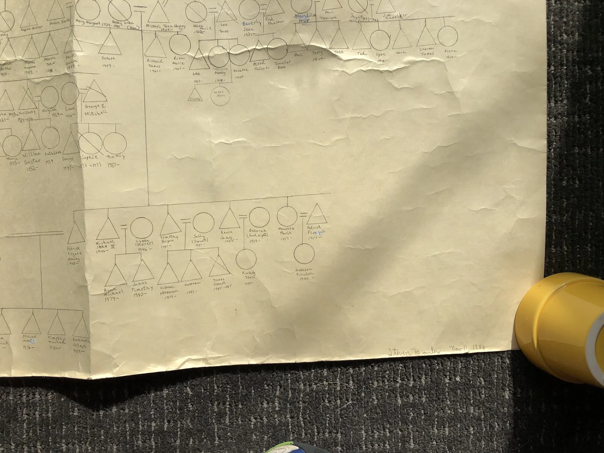 Perhaps this is when it all started — November, 1986 in Mrs. Hanby’s 5th grade class at Fairfield West Elementary. A lesson on genealogy led to this family tree, my first, that I have held on to ever since. With a ballpoint pen, ruler, poster board, white out, and significant help from my mother, my foray into family tree making began.